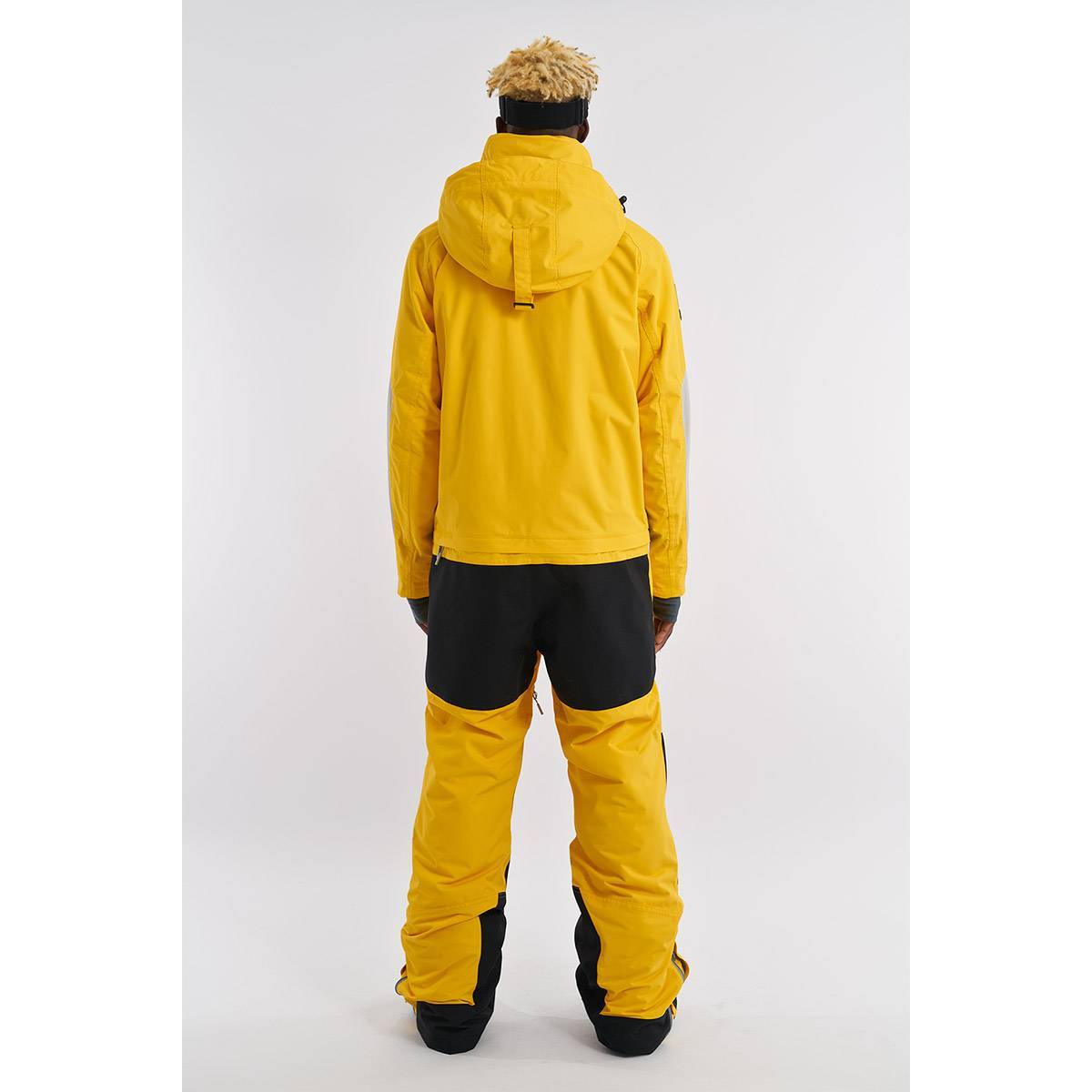 Прочная и износостойкая мембранная ткань, система утяжки краев штанин для предотвращения их износа и загрязнения, вентиляция с вставками из сетки, теплые карманы для рук с флисовой подкладкой, специальный карман для скипасса на рукаве, съемные подтяжки.