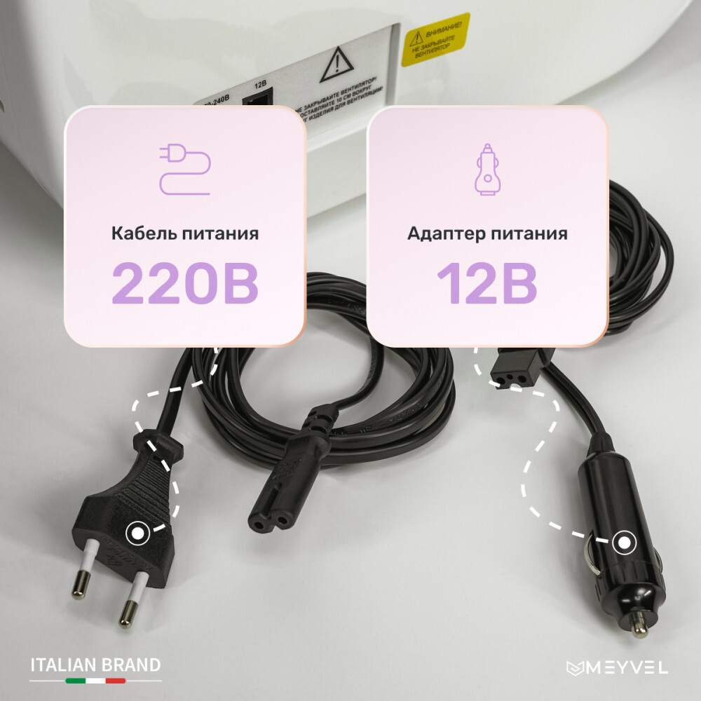 Модель Meyvel MB-25HC1W подключается как в бытовой сети 220 В, так и к прикуривателю автомобиля 12 В. Это означает, что использовать его получится не только дома, но и в дороге.