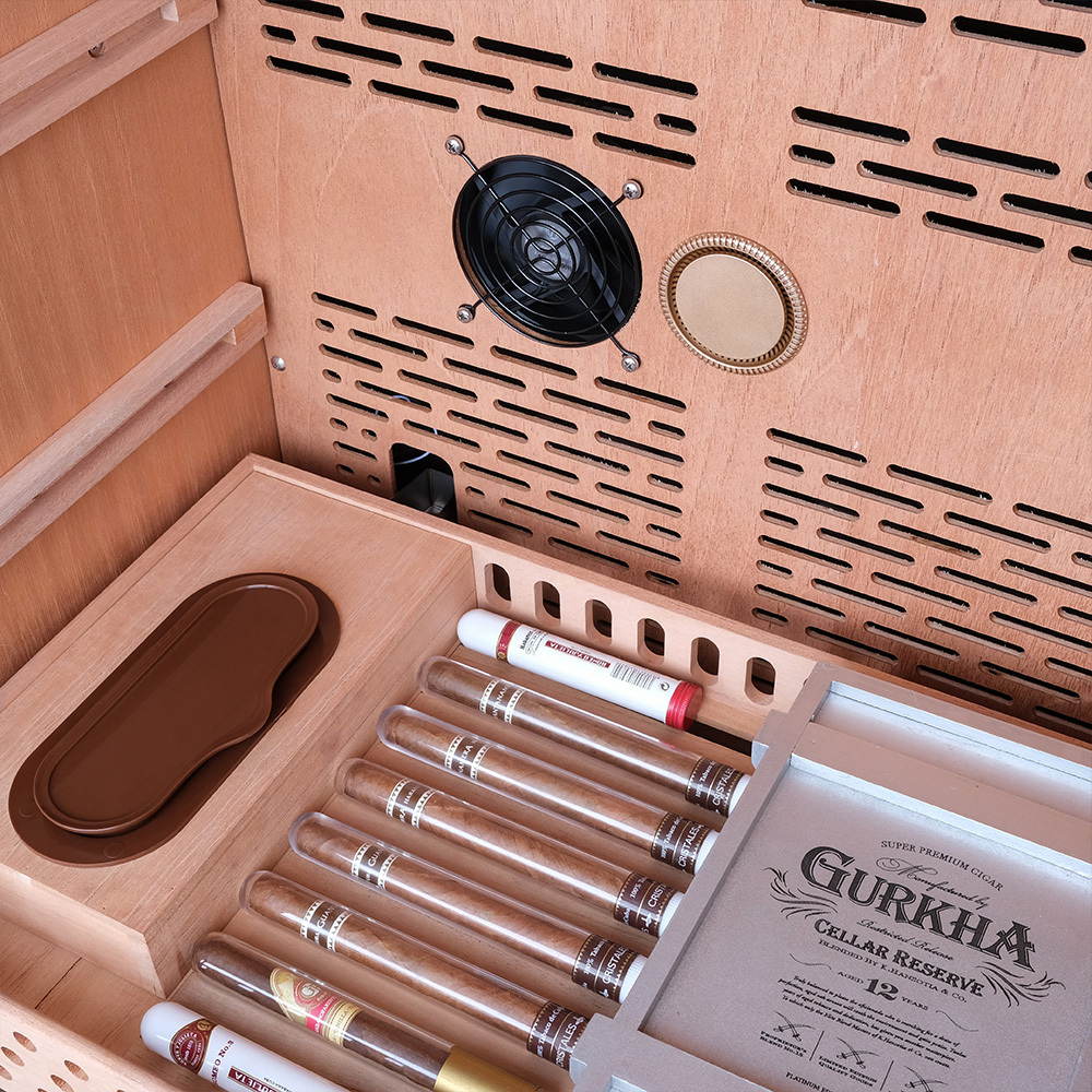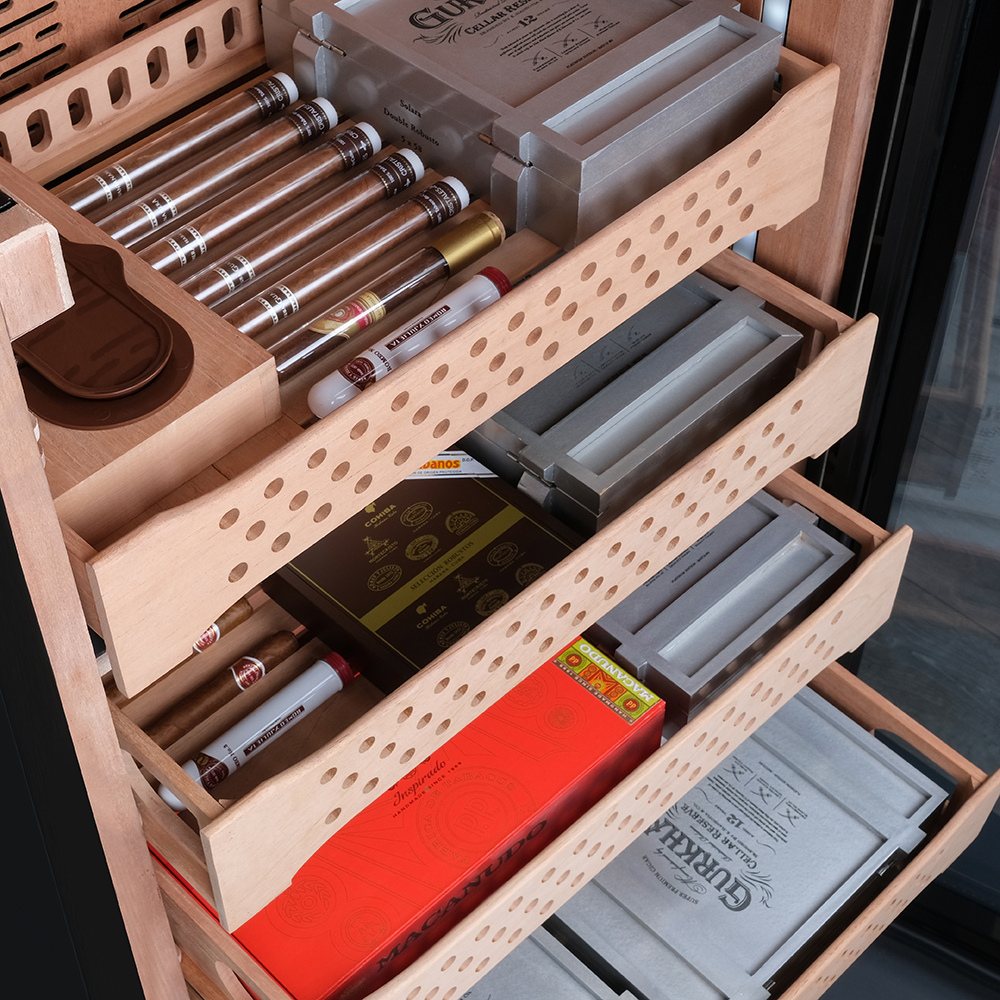 Особенность модели — точный температурный контроль в диапазоне от +16 до +22°C и уровень влажности 60-75%, что позволяет поддерживать оптимальные условия для хранения и бережного созревания табачных изделий. Внутренняя подсветка и встроенный гигрометр упрощают мониторинг состояния коллекции.