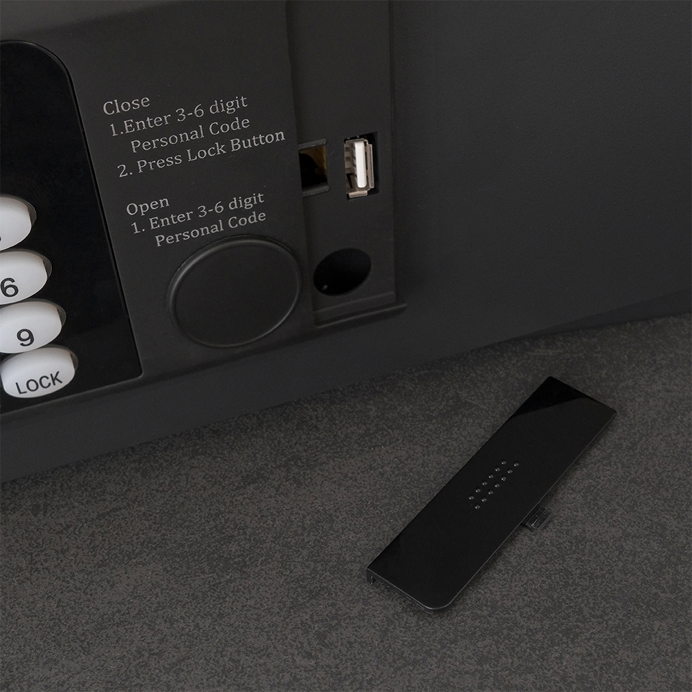В случае, если установленные в сейфе батарейки разрядились и Вы не успели их заменить — на лицевой панели сейфа есть USB-разъём для подключения внешнего блока электропитания. Нужно подключить этот блок и открыть сейф пользовательским или мастер кодом.